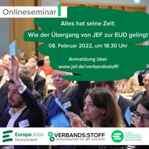 Wie der Übergang von der JEF zur Europa-Union gelingt, ist eine wichtige Frage der Mitgliederbindung. Gerade nach zwei Jahren Pandemie, die die Mitgliederentwicklung negativ beeinflusst hat, ist es wichtig, diese Gruppe in den Blick zu nehmen. Am Dienstag, den 8. Februar 2022, führen EUD und JEF von 18.30 bis 19.45 Uhr zu diesem Thema eine online Akademie durch. » weiterlesen