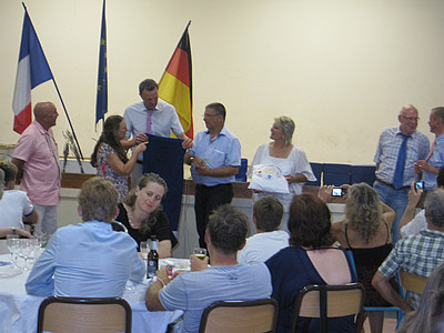 3. Geschenke überreichten Bürgermeister Vesper und Volker Damm an Bürgermeister Fermi Carrera (l.) und Eliane Pifaud, die Vorsitzende der Amicale (r.); davor die unermüdliche Dolmetscherin Claudine Henriot.