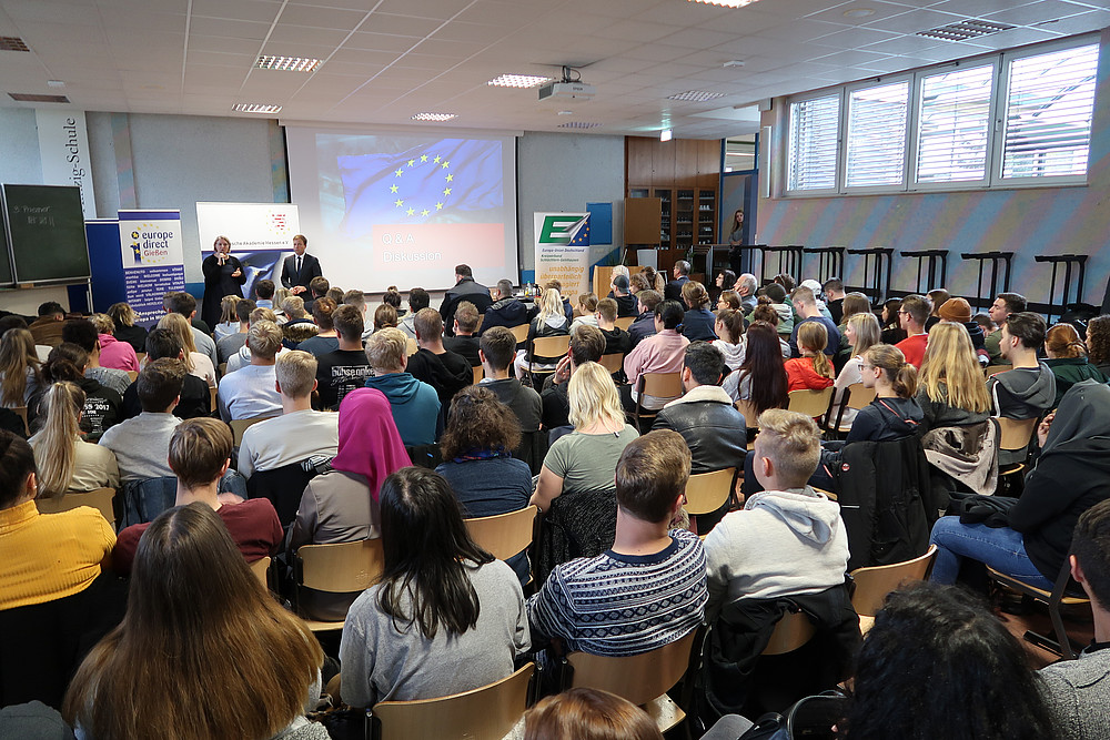 Und die Impulse unter dem Motto „Create your Future“ zeigten Wirkung: Zahlreiche junge Zuhörer meldeten sich mit vielen grundsätzlichen und auch kritischen Fragen zu Wort, die eine lebhafte und sachliche Diskussion nach sich zogen. Spätestens hier wurde deutlich: Auch wenn Unterscheidungen zwischen Europäischer Union, Eurozone und Europarat nur bedingt zur Lebensrealität von Jugendlichen gehören und auch die Frage nach den örtlichen Europaabgeordneten eher betretenes Schweigen erzeugte – Meinungen und Überzeugungen zur Zukunft ihres Europas sind auch bei jungen Leuten durchaus vorhanden.