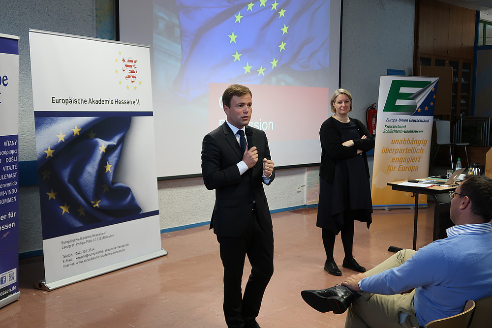 „Wir leben in einer Zeit von Frieden, Freiheit und in weiten Teilen wirtschaftlichem Wohlstand in Europa. Gleichzeitig steht die Europäische Union unter so existenziellem Druck wie nie zuvor. Über beides wollen wir heute anlässlich besonderer Jubiläen in Schlüchtern sprechen: Zum Gründungstag der Europäischen Akademie in Hessen vor genau 70 Jahren und dem in Münster unterzeichneten Friedensvertrag zum Ende des 30-jährigen Krieges vor 370 Jahren.“ Mit gewichtigen Worten eröffnete Prof. Dr. Sven Simon als Vorsitzender der Europäischen Akademie Hessen e.V. den „Tag der Europäischen Akademie“ in Schlüchtern. Gemeinsam mit Marlies von der Malsburg stellte er an der Kinzigschule vor über 100 Schülerinnen und Schülern die Strukturen, Problemstellungen und Zukunftsfragen der Europäischen Union vor. So habe die EU mit der Euro-, Staatsschulden- und Wirtschaftskrise sowie den fortbestehenden Divergenzen in der Migrationspolitik die vielleicht größten Herausforderungen seit ihrer Gründung zu schultern. Manche forderten bereits eine Stärkung der Nationalstaaten, andere wiederum sehen eine Lösung der Krise nicht in weniger, sondern in mehr Europa.