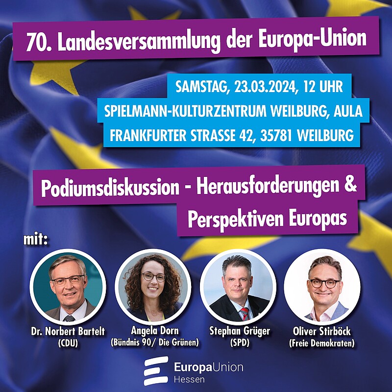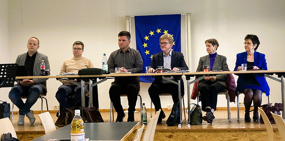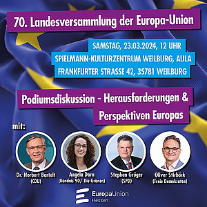 Im öffentlichen Teil der Landesversammlung diskutierte ein hochkarätiges Panel die Herausforderungen und Perspektiven für Europa. Unter der Moderation des Landesvorsitzenden Thomas Mann brachten die Landtagsabgeordneten Dr. Ralf-Norbert Bartelt (CDU), Oliver Stirböck (FDP), Angela Dorn (Bündnis '90/ Die Grünen) und Stephan Grüger (SPD) ihre Perspektiven zu mehreren Themenkomplexen der Europapolitik und trafen damit auf ein lebhaftes Interesse der Tagungsteilnehmer und Gäste.