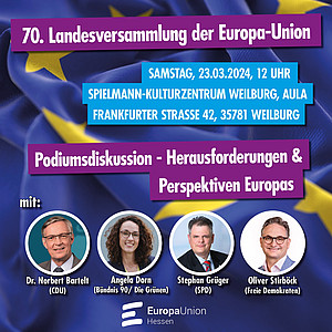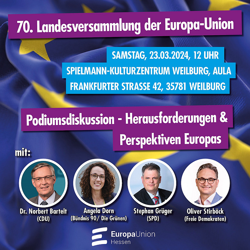 Die 70. Landesversammlung der überparteilichen Europa-Union Hessen, die am 23. März 2023 in Weilburg stattfand, war ein inspirierendes und wegweisendes Ereignis. Unter der Organisation von Hans-Peter Schick kamen engagierte Menschen zusammen, um über die Zukunft Europas zu diskutieren.