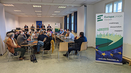Der Kreisvorsitzende des Kreisverbands Oberlahn, Tobias Eckert, begrüßte die Teilnehmerinnen und Teilnehmer mit einem herzlichen Grußwort. Seine Worte ermutigten dazu, sich aktiv für ein starkes und geeintes Europa einzusetzen.