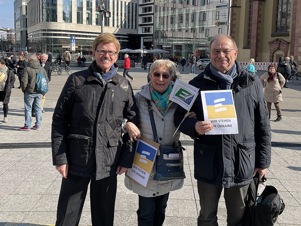 Zu einer Demonstration, zu der die Initiative „Pulse of Europe“ aufgerufen hatte, versammelten sich ca. 4000 demonstrierende Menschen vor der Hauptwache in Frankfurt. Mit dabei war auch der Vorsitzende der Europa-Union Wetterau; Dr. Johannes Fertig und Edda Weber, Mitglied der Kreisvorstands. Fertig berichtet von einer bewegenden Veranstaltung, bei dem sich Rednerinnen und Redner gegen den Krieg in der Ukraine und der Notwendigkeit einer noch besseren Zusammenarbeit in der Europäischen - Union aussprachen. An der Veranstaltung nahm auch der Landesvorsitzende der Europa-Union Hessen, Herr Thomas Mann und weitere Mitglieder der Europa-Union aus der Region Rhein-Main teil.