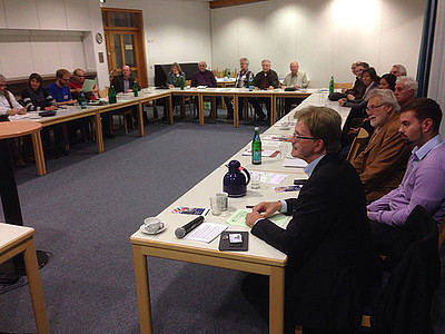Den Sonntagmorgen startete Thomas Mann mit einem Referat über das Europäische Parlament, ein Jahr nach der Wahl. Er schilderte die destruktive Politik von Links- und Rechtsradikalen und die umso wichtigere Kooperation der demokratischen Kräfte, um die europäische Gemeinsamkeit zu sichern. In Workshops behandelten wir Absichtserklärungen und konkrete Maßnahmen zur Flüchtlingshilfe. Dazu wurden einige bedeutsame Reden analysiert: vom Kommissionspräsidenten Jean-Claude Juncker zur Lage der Union, von Angela Merkel und François Hollande - gemeinsam im Europäischen Parlament in Straßburg - , vom Bundespräsidenten Joachim Gauck in der Alten Oper Frankfurt zum 25. Jahrestag der deutschen Wiedervereinigung, ebenso Beschlüsse der Deutschen Bundesregierung und der Kompromiss zwischen Bund und Ländern zur Bewältigung der Flüchtlingskrise.