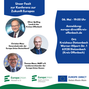 „Unser Fazit zur Konferenz zur Zukunft Europas“ lautet der Titel der gemeinsamen Veranstaltung der Europa-Union Hessen, der Europa-Union Stadt und Kreis Offenbach und des Europe-Direct Relais Rhein-Main.