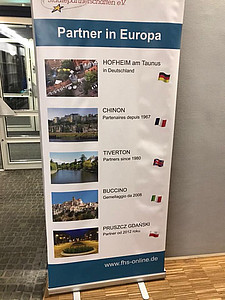 Ingrid Bender, Vorsitzende des Förderkreises Hofheimer Städtepartnerschaften e.V. und ihr Team stellen erfolgreiche Projekte mit den Partnerstädten vor. Dazu gehören Begegnungen in Chinon (Frankreich), Tiverton (Großbritannien), Buccino (Italien) und Pruszcz Gda?ski (Polen).