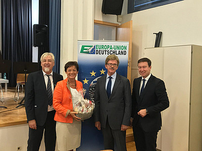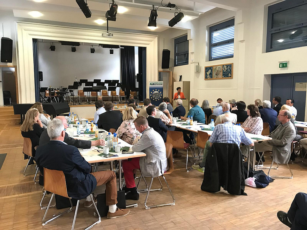 Neben Grußworten von Landrat und Bürgermeister zeigten sich die Anwesenden interessiert an den Ausführungen der Hessischen Europaministerin Lucia Puttrich, die die Europastrategie des Landes Hessens vorstellte und emotional für die Werte der Gemeinschaft warb. In ihren Jahresberichten zeigten sich Landesvorsitzender Thomas Mann und Landesgeschäftsführer Sven Ringsdorf erfreut über die weitgehend stabilen Mitgliederzahlen. Nachdem in den letzten Jahren altersbedingt einige Verluste zu verzeichnen waren, konnte die Mitgliederzahl gerade vor dem Hintergrund erwachsender PRO-europäischer Stimmung auf 1500 Mitglieder stabilisiert werden.